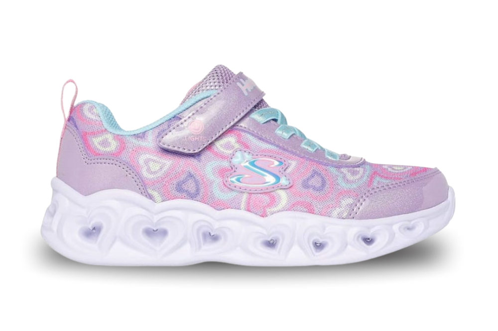 The Boogie Love from Skechers is a delightful show full of twinkling fun! This sneaker features a sparkly, heart-printed synthetic upper and stretch laces with an adaptive closure for a custom fit. Complete with a heart-themed light-up midsole, a cushioned insole and a flexible traction outsole for all-day comfort. These shoes are the perfect new and sparkly addition to the wardrobe.