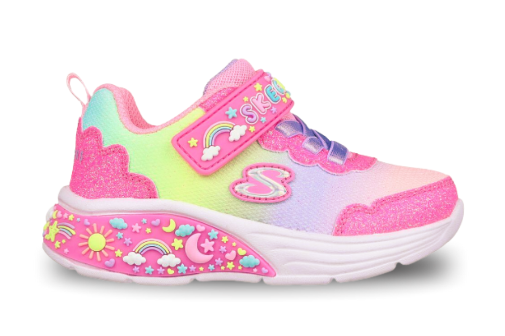 The Pastel Sunset from Skechers will let your little one sparkle and shine. This sporty design features a mesh and synthetic glitter upper with stretch laces, a fun light-up graphic, and a cushioned comfort insole. Designed for easy-on, easy-off with an adaptive closure that also creates a customised fit. Perfect for running around and exploring everyday.